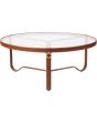 Der Adnet Coffee Table wurde in den 1950er Jahren von dem renommierten französischen Architekten und Designer Jacques Adnet entworfen, der für seine avantgardistischen Möbelstücke bekannt war, die oft Leder und Metall kombinierten. Der Tisch zeichnet sich durch seine luxuriöse und zeitlose Ästhetik aus. Der Tisch besteht aus einem runden oder rechteckigen Glasplatte, die auf einem Gestell aus Leder und Metall ruht. Das Ledergestell ist oft mit dekorativen Messingbeschlägen versehen. Der Tisch vereint moderne und klassische Elemente und fügt sich nahtlos in verschiedene Einrichtungsstile ein. Der Lederrahmen ist in verschiedenen Farben erhältlich, typischerweise in Schwarz oder Braun. Der Adnet Coffee Table ist in verschiedenen Größen erhältlich, um unterschiedlichen Raumanforderungen gerecht zu werden. Der Tisch eignet sich hervorragend für moderne und klassische Einrichtungsstile und bringt einen Hauch von Luxus in jedes Zuhause.