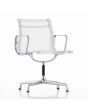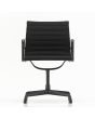 Mit dem EA 104 schufen Charles und Ray Eames ein Sitzmöbel, das auch Jahrzehnte nach seiner Entstehung nichts von seiner Aktualität verloren hat. Seine elegante Silhouette, die makellose Verarbeitung und der unvergleichliche Sitzkomfort machen ihn zu einem Stuhl, der nicht nur genutzt, sondern erlebt wird – ein Designklassiker für Generationen. Die gespannte Stoff- oder Lederbahn zwischen den seitlichen Aluminiumprofilen bildet Sitzfläche und Rückenlehne in einem – ohne Polster, aber mit überraschend hoher Elastizität und Ergonomie. Der Körper ruht nicht auf einem Sitzkissen, sondern in einer sanft federnden Konstruktion, die sich angenehm anpasst und dabei stets ihre elegante Kontur bewahrt. Das feine Vierstern-Untergestell aus Aluminiumdruckguss verleiht dem EA 104 Stabilität und Leichtigkeit zugleich. Durch seine leicht nach hinten geneigte Sitzposition und die filigranen Armlehnen eignet sich der Stuhl ideal für den Esstisch, Konferenzräume oder stilvolle Homeoffices. Seine kompakte Form und aufrechte Haltung machen ihn besonders geeignet für Räume, in denen Präsenz und Eleganz gleichermaßen gefragt sind.