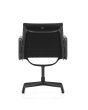 Die Aluminium Chair Group gehört zu den bedeutendsten Möbelentwürfen von Charles und Ray Eames. Der Eames Aluminium Chair EA 108 ist Teil der ikonischen Aluminium Group der bekannten Designer. Er ist heute der Inbegriff des klassischen Konferenzstuhls. Der Stuhl passt sich dem Körper an und bietet hohen Komfort. Der Vitra Aluminium Chair EA 108 ist drehbar, aber wird mit Armlehnen gefertigt. Das Modell wird mit einem Untergestell mit 4-Sternfuss in Aluminium-Druckguss poliert, verchromt oder tiefschwarz pulverbeschichtet hergestellt. Der Stuhl hat mittelhohe Rückenlehne und tischorientierte Sitzposition. Traversen am Rücken und unter dem Sitz verbinden die beiden seitlichen Aluminiumrahmen und sorgen für die benötigte Spannung der Polsterung. Der Bezug ist aus hochwertigem Hopsak, Leder oder Leder Premium gefertigt. Optional ist der Rückseiten-Bezug in Leder für einen Aufpreis möglich. Der Chair EA 108 ist gut für den Einsatz am Ess- oder Schreibtisch geeignet.
