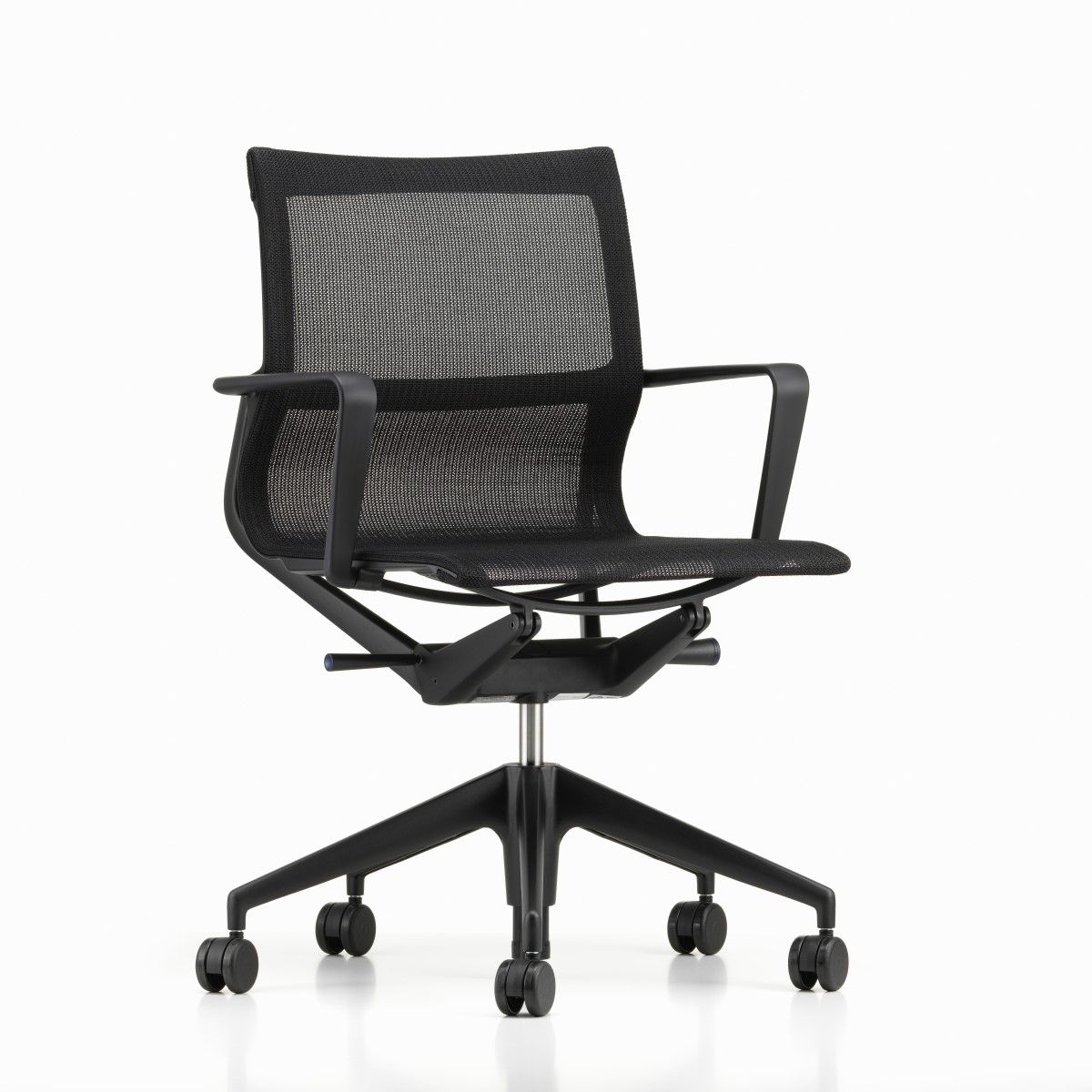 Physix Drehstuhl von Alberto Meda besticht die grazile Silhouette. Die ergonomisch gebogene, aber durchgehende Sitzschale zeichnet sich durch ein zwischen den beiden Seitenholmen frei verspannten Strickbezug „TrioKnit“ aus. Diese Konstruktion verleiht dem Bürostuhl einerseits einen optisch feinen Ausdruck, andererseits einen flexiblen und angenehmen Sitzkomfort. Der Stuhl bietet gesunden Halt und mobile Positionen durch einen synchronen Bewegungsablauf. Physix hat Fünfstern-Untergestell aus Aluminium-Druckguss, pulverbeschichtet, und Sitzhöhe ist über Gasfeder stufenlos verstellbar. Einteilige Sitz- und Rückenfläche sind mit freiverspanntem Gestrickbezug TrioKnit gepolstert. Der Stuhl ist mit Rollen für harte Böden oder für Teppichböden erhältlich. Besonderheiten des Physix Drehstuhls sind Eleganz, Langlebigkeit, leichte Konstruktion und High-Tech-Textil. Physix ist ein Bürostuhl für aktives Sitzen.